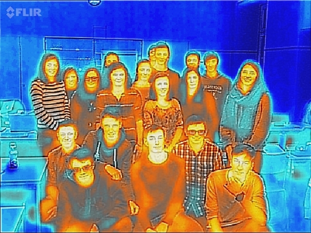 Das Klassenfoto des G1ACE beweist, was wir schon lange vermuteten: AETNA-SchülerInnen sind besonders cool! Die Wärmebildkamera zeigt Oberflächentemperaturen in Falschfarben an.